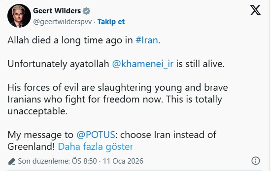 "Allah, İran'da uzun zaman önce öldü. Ne yazık ki Ayetullah hala hayatta. Onun kötü güçleri, şu anda özgürlük için savaşan genç ve cesur İranlıları katlediyor. Bu kesinlikle kabul edilemez. Trump'a mesajım: Grönland yerine İran'ı seç!"