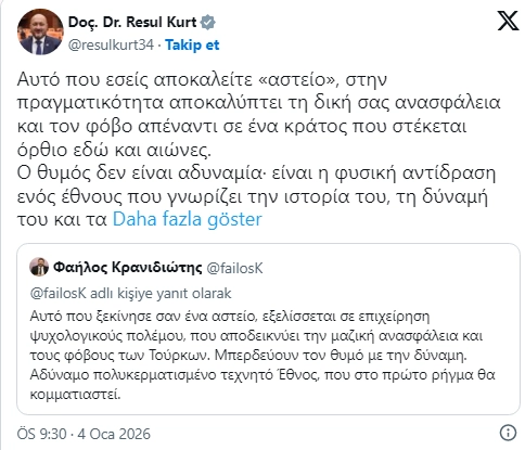 Kranidiotis'in bu provokatif ve hakaret içeren sözleri kısa sürede tepki topladı. Yunan siyasetçinin bu hezeyanlarına cevap gecikmedi. AK Partili Resul Kurt, Kranidiotis'in sözlerini alıntılayarak sert bir açıklama yaptı.